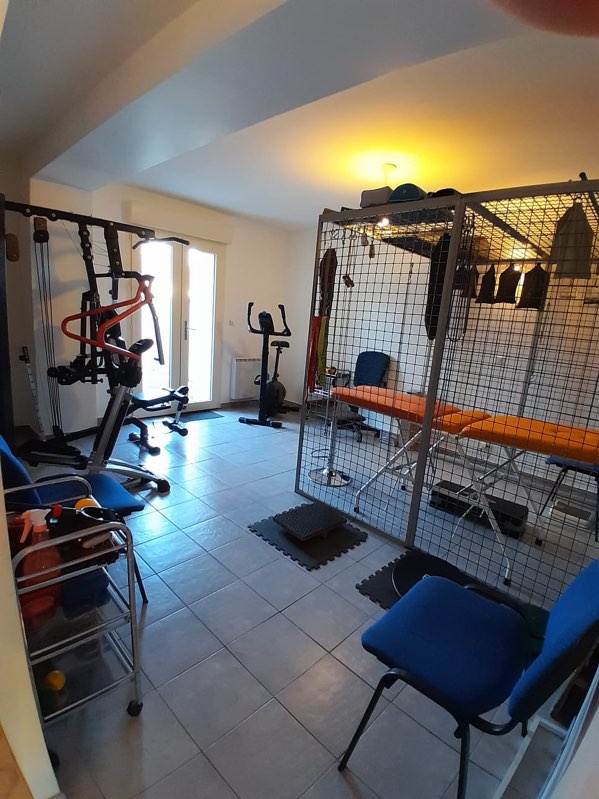 - une salle de rééducation avec appareil de musculation, stepper, vélo, cage de pouliethérapie, plateau vibrant et divers accessoires