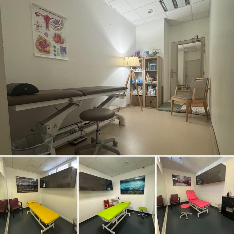 Travail au sein d'un cabinet de 90m2, neuf de 2 ans, comprenant 4 salles de rééducation et un plateau technique de 30m2.