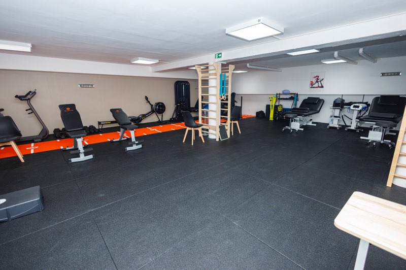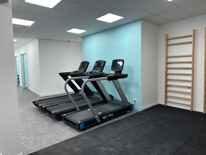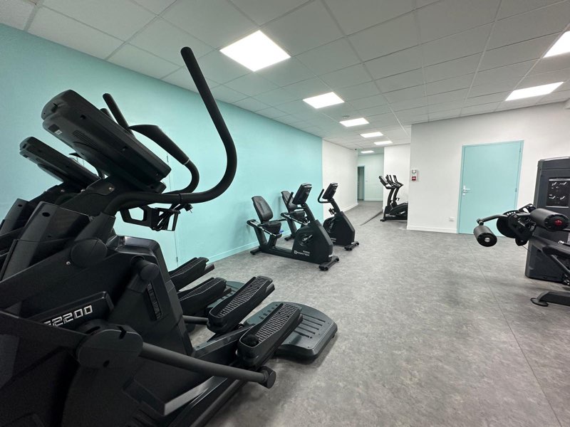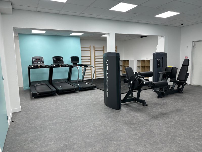 ✅ Étage inférieur : 3 cabines de 13m2 + grand plateau technique de 90 m² avec matériel complet de rééducation : Piste de 9m avec sled, Rameur Concept 2, vélo (Technogym), Press et Leg curl/extension (Matrix), 3 espaliers, 2 bancs, tous types de Poids, 4 tables réglables sur le plateau, Bosu, aquabag, matériel de proprioception et pour main/poignet etc…