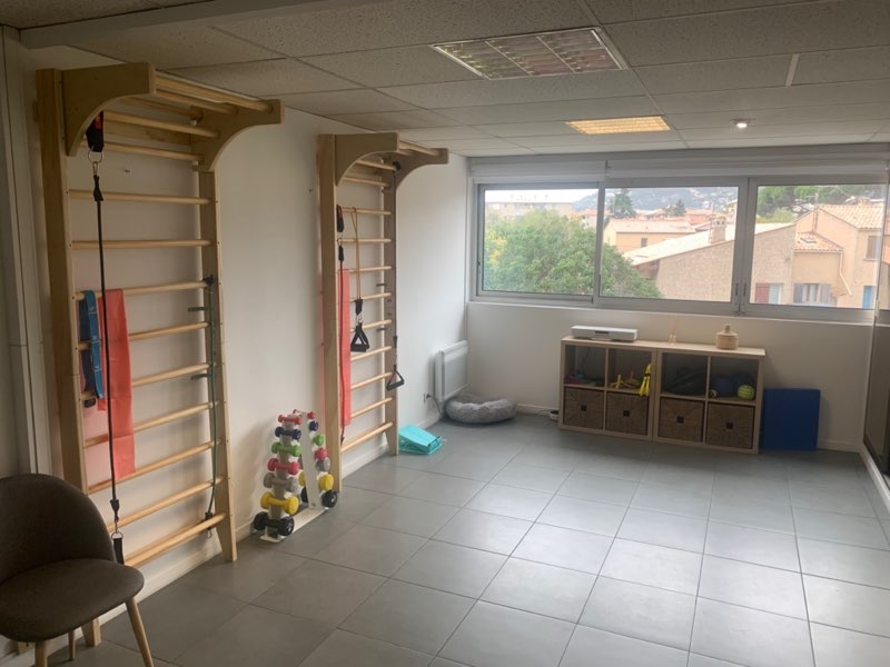 Cabinet de 95m2 : une salle d'attente, un grand gymnase avec vélo, elliptique, rack renforcement avec barre et poids (dumble, etc...), espaliers et une table, deux box pour soins individuels et un troisième box pour pressothérapie ou physiothérapie.