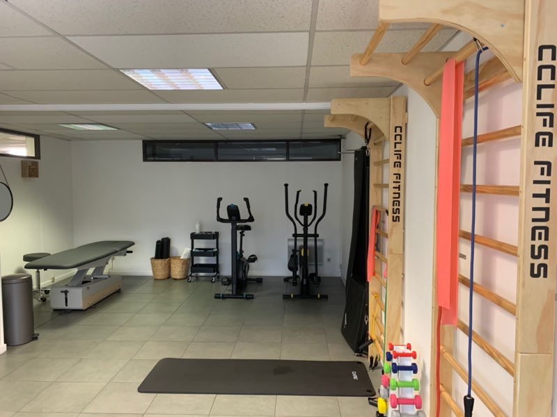 Le cabinet est spacieux 135 m2, avec plateau technique, station de muscu, presse, elliptique, salle d'étirement avec tatamis et espalier, cuisine et grand jardin.