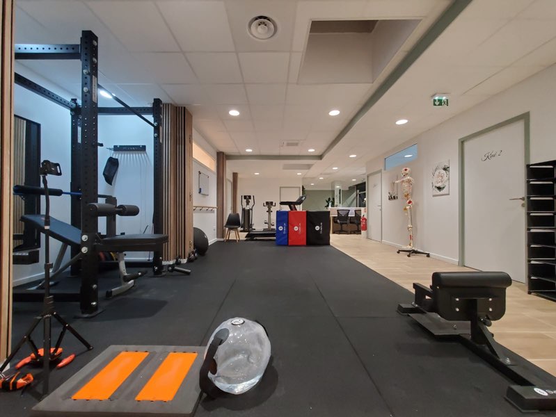 ✅ RDC : 6 cabines spacieuses de 10m2 avec tables électriques + plateau technique 25 m² avec espace Rack, Barre olympique, Poids, tapis de course, vélo (Technogym), vélo elliptique (idem), box ainsi que tout le matériel de proprioception nécessaire