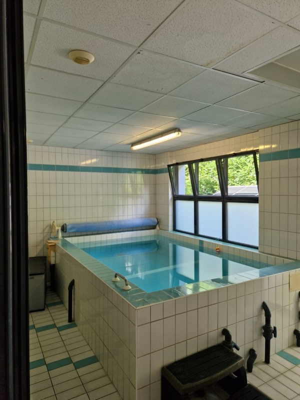 L'espace balnéothérapie comprend une piscine de 5 m sur 4 équipée de nombreux jets de massage à différentes hauteurs, trois cabines de déshabillage et deux douches.