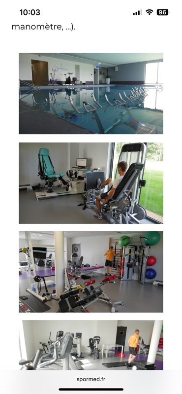 patientèle variée (sportif, orthopédique, post-op, réadaptation à l'effort, partenariat avec clubs de niveau national)