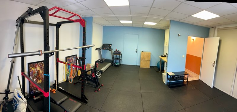 Gymnase lumineux de 70m2 bien équipé : matériels de musculation,vélos… Travail sur Doctolib et liberté sur le planning ! Ambiance au top !